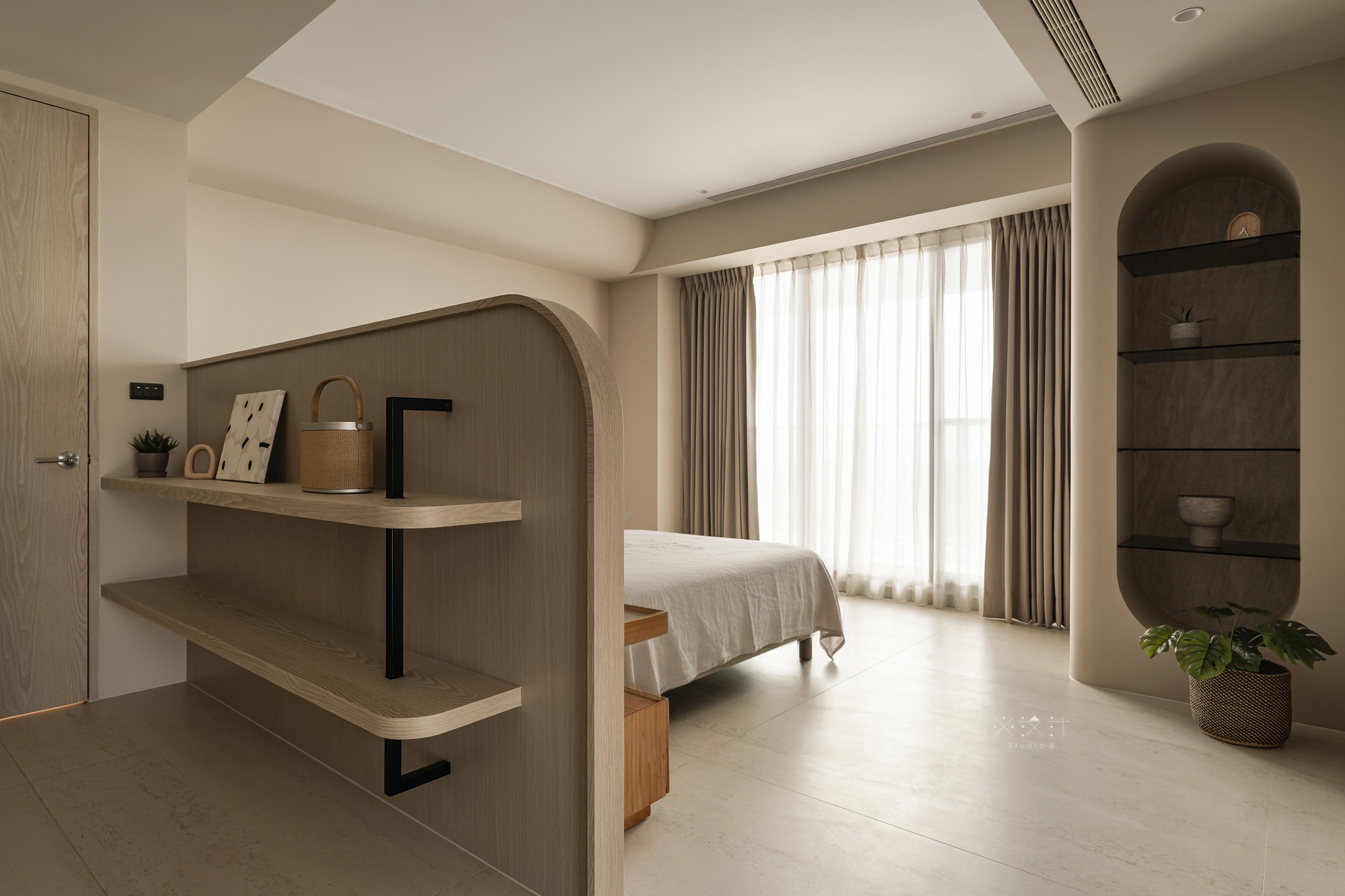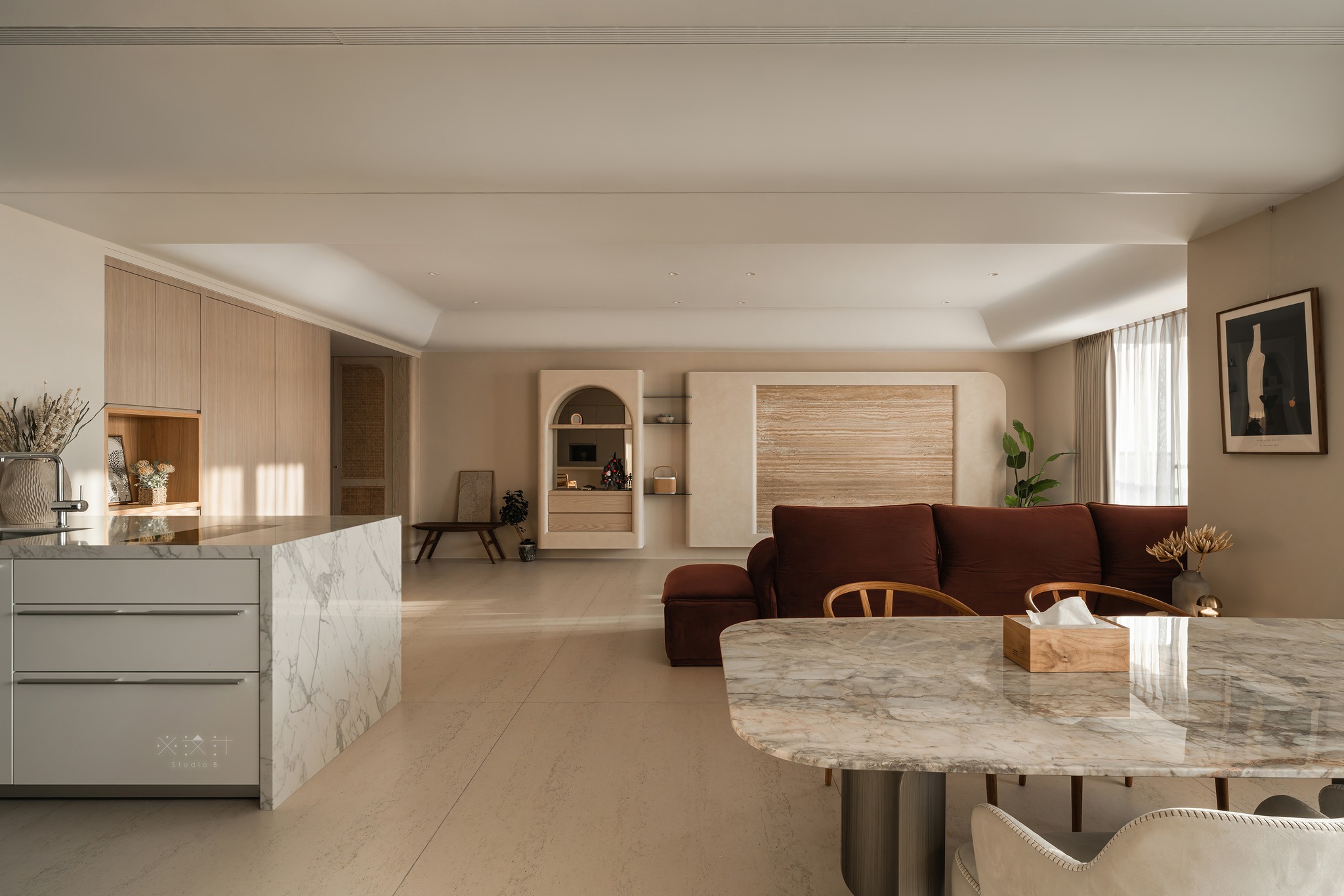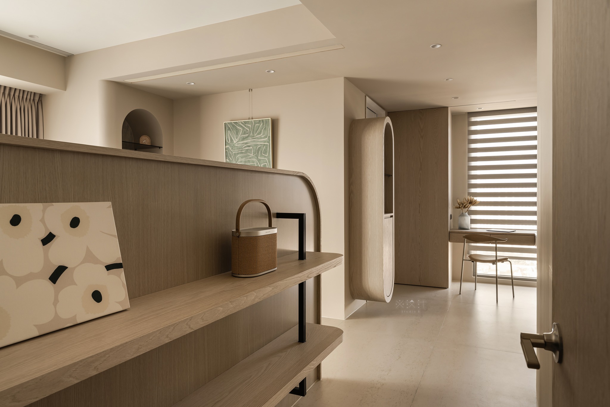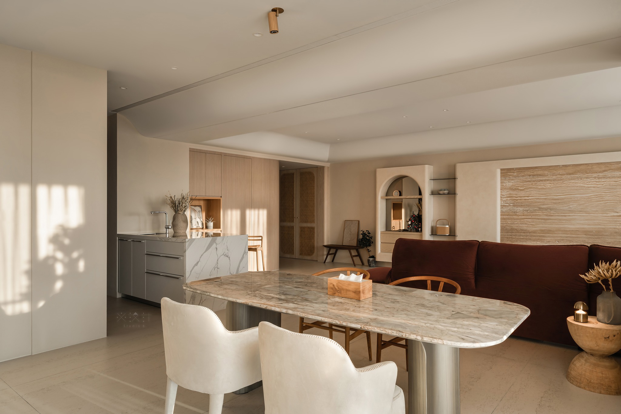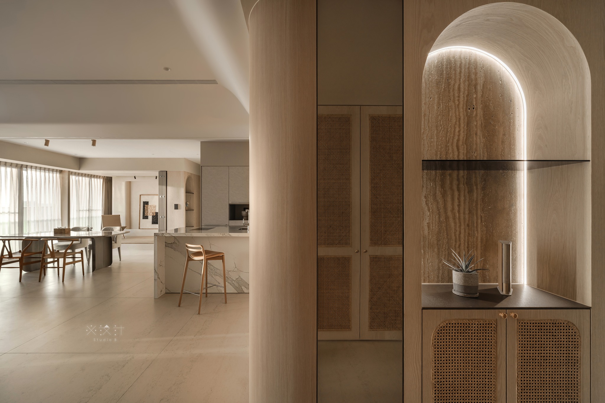 Chi tiết vòm (Arch): Hệ tủ trang trí và vách ngăn được thiết kế dạng vòm, không chỉ đồng nhất với hệ trần mà còn gợi nhắc đến các cấu trúc kiến trúc cổ điển được làm mới theo tinh thần tối giản.
