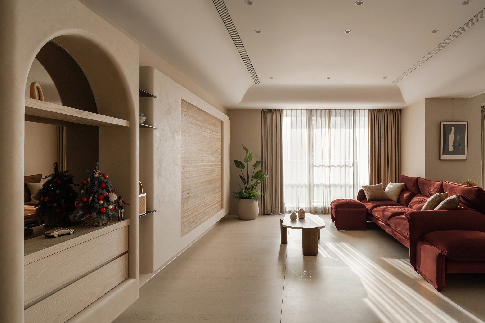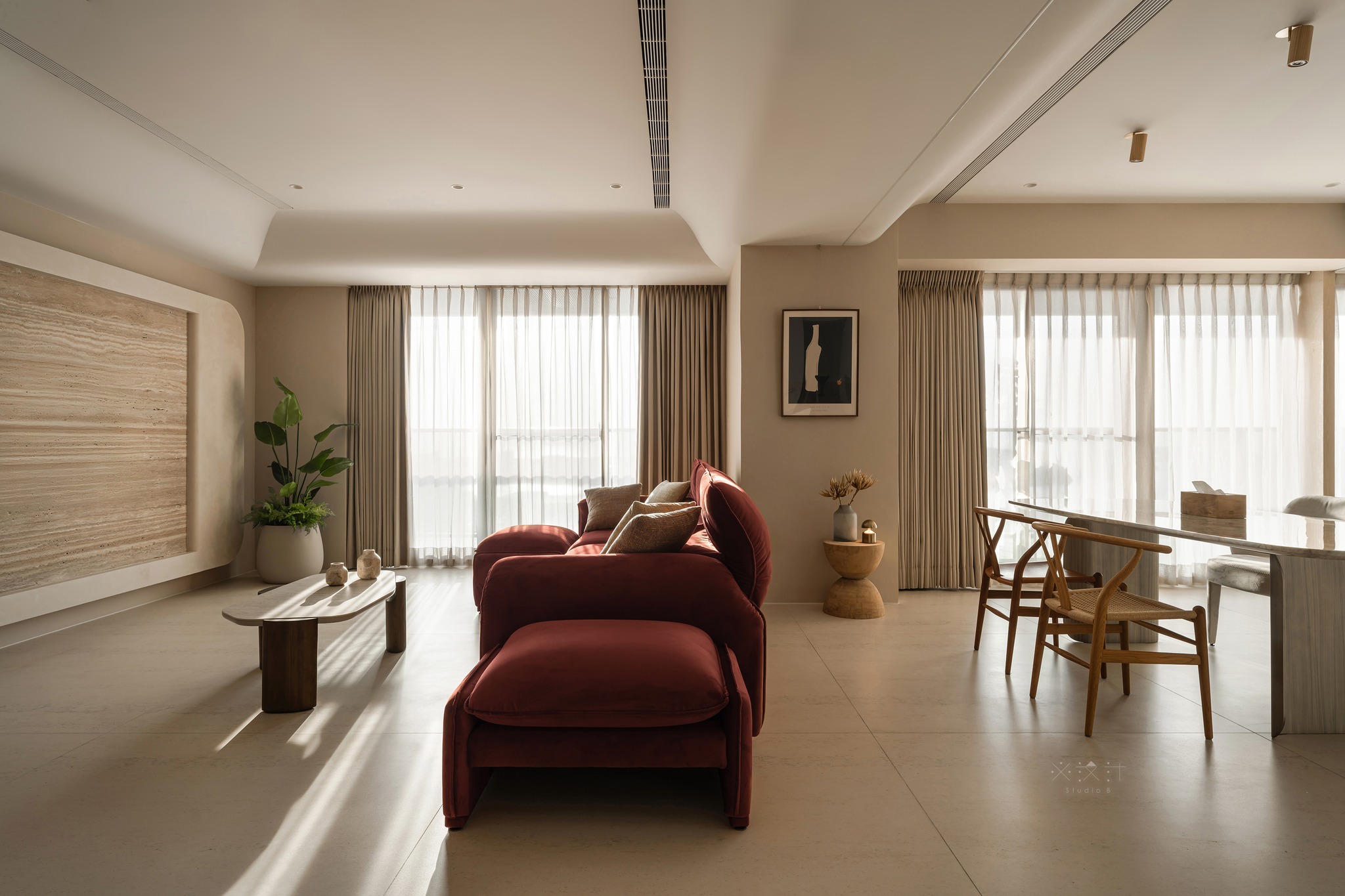 Điểm nhấn thị giác mạnh mẽ nhất của phòng khách nằm ở bộ sofa bọc nhung màu đỏ rượu vang thẫm. Đây là một sự lựa chọn đầy dụng ý kiến trúc, đóng vai trò như một thực thể mang màu sắc nồng nàn để phá vỡ sự đơn điệu của bảng màu kem chủ đạo, đồng thời tạo ra chiều sâu cảm xúc cho một không gian vốn thiên về sự tĩnh mịch.