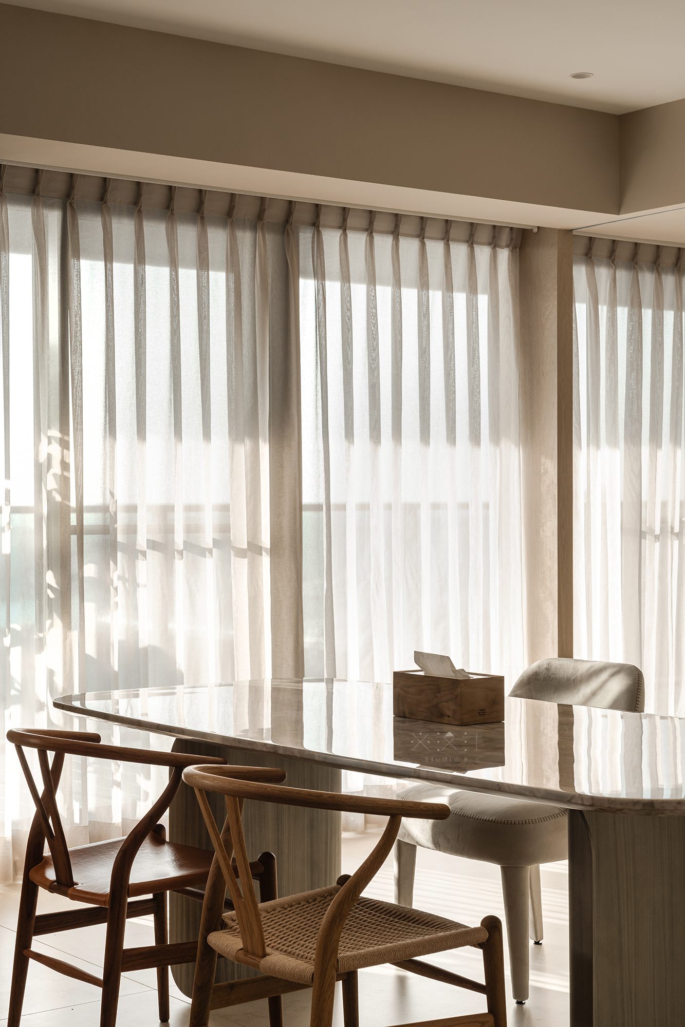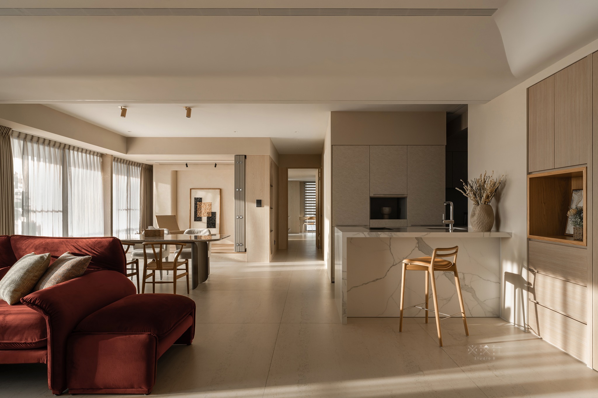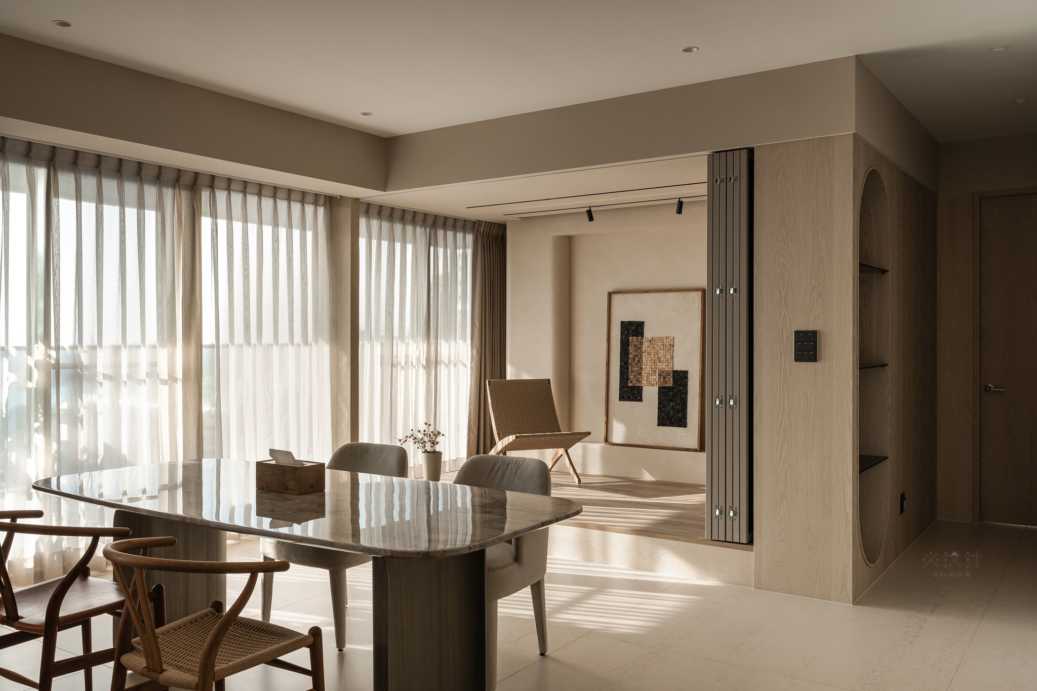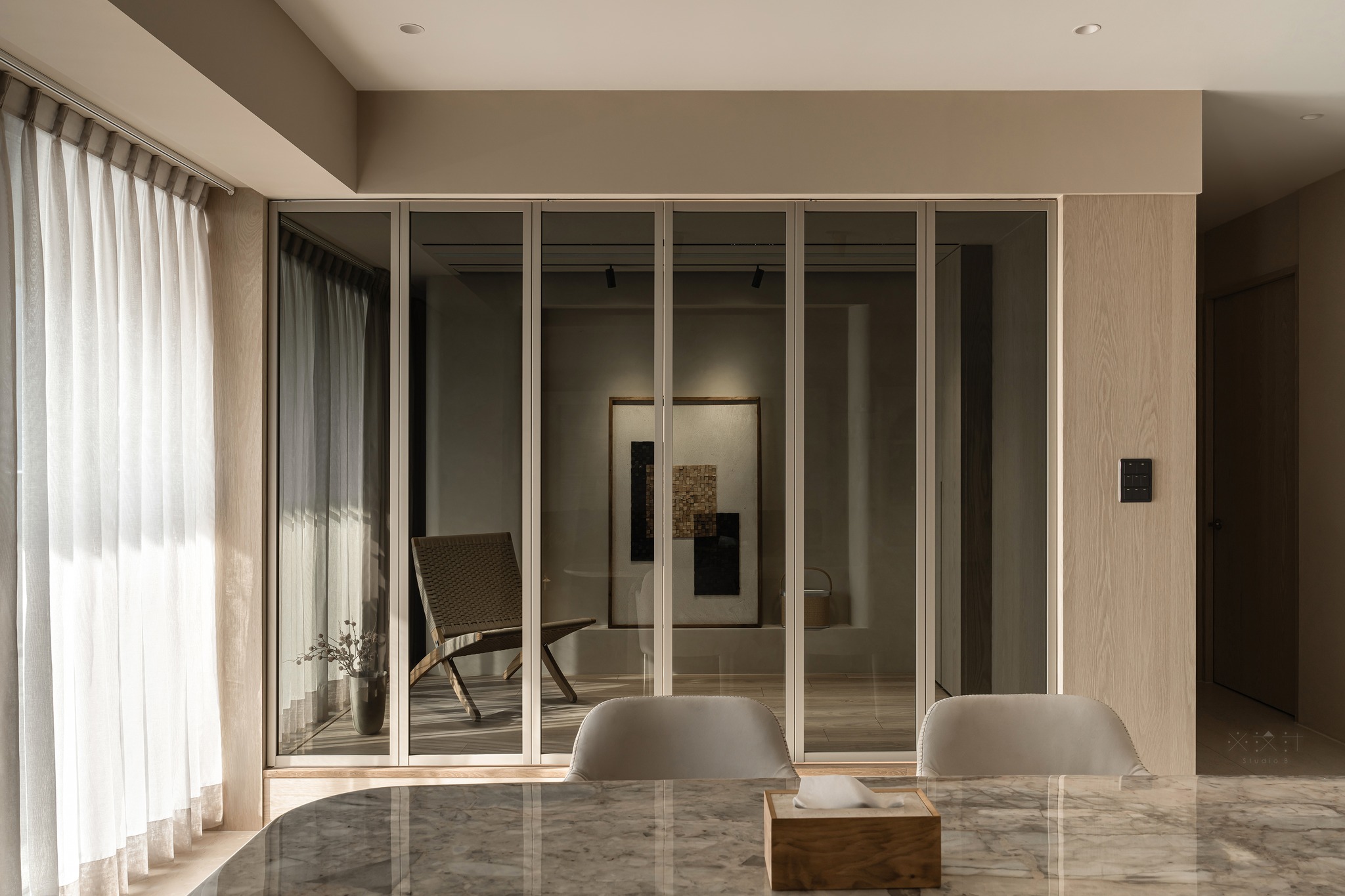 Ánh sáng tự nhiên được coi là một thành phần kiến trúc hữu hình trong thiết kế này. Thông qua lớp rèm voan mỏng và rèm vải be dày dặn, ánh sáng được điều tiết để tạo nên những hiệu ứng bóng đổ mềm mại trên sàn gạch giả đá khổ lớn.