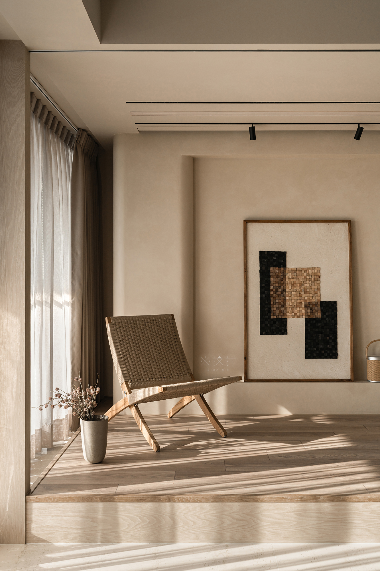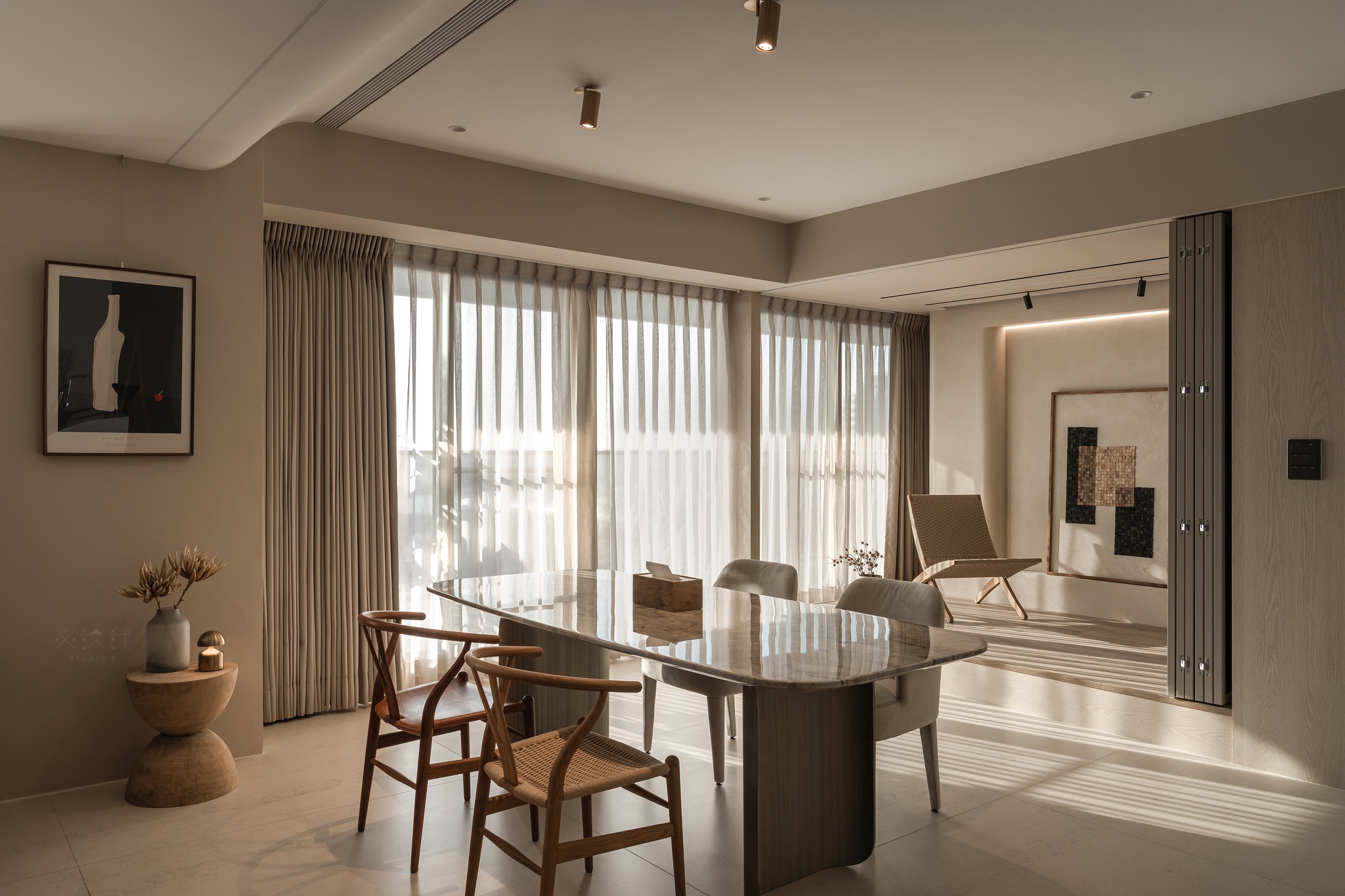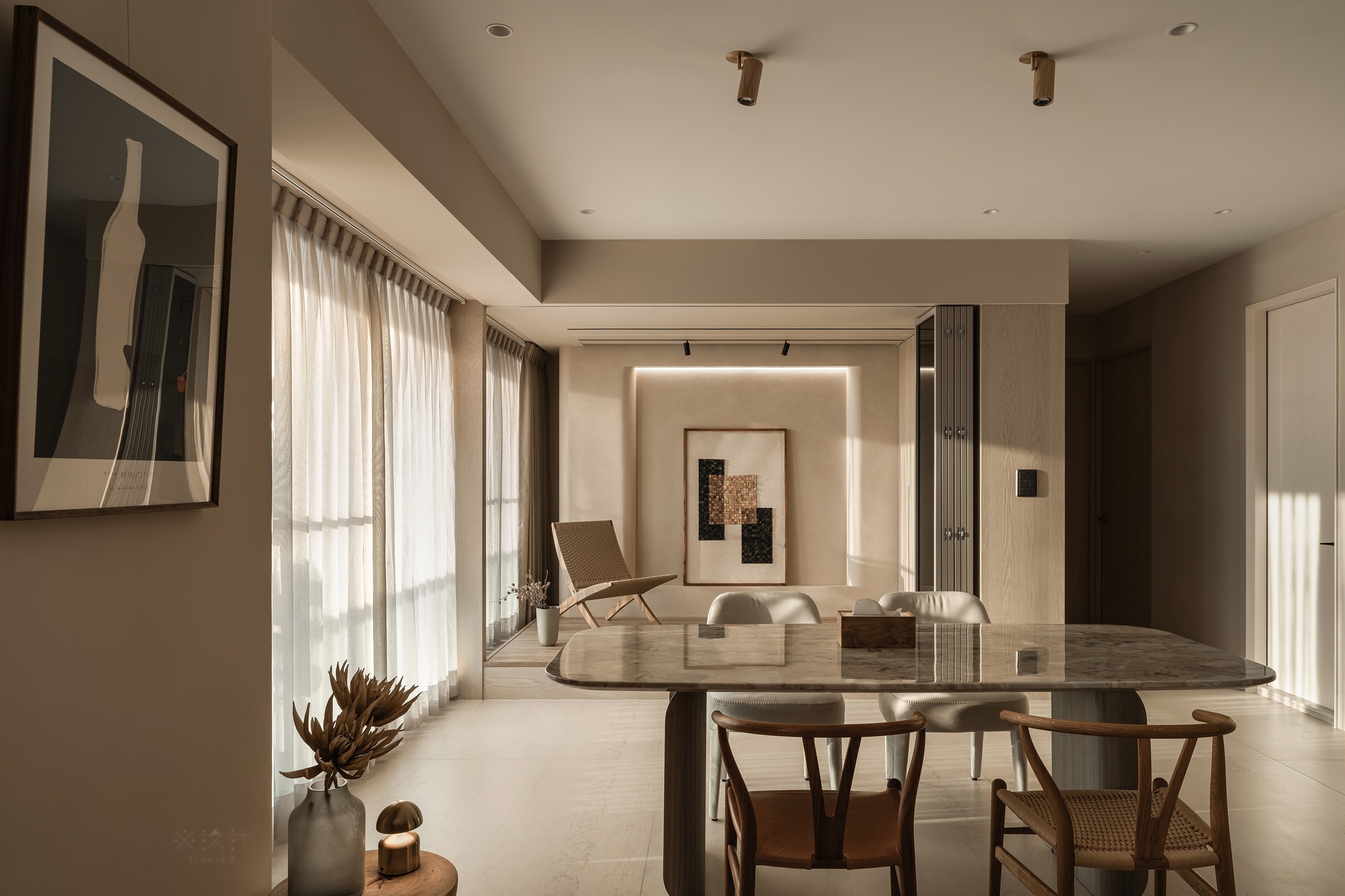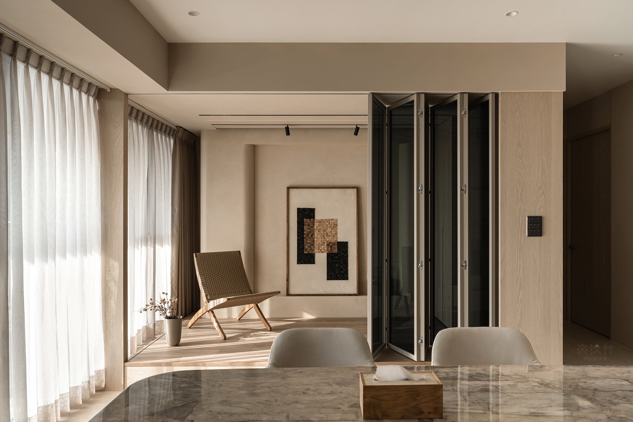 Ánh sáng tự nhiên được coi là một thành phần kiến trúc hữu hình trong thiết kế này. Thông qua lớp rèm voan mỏng và rèm vải be dày dặn, ánh sáng được điều tiết để tạo nên những hiệu ứng bóng đổ mềm mại trên sàn gạch giả đá khổ lớn.