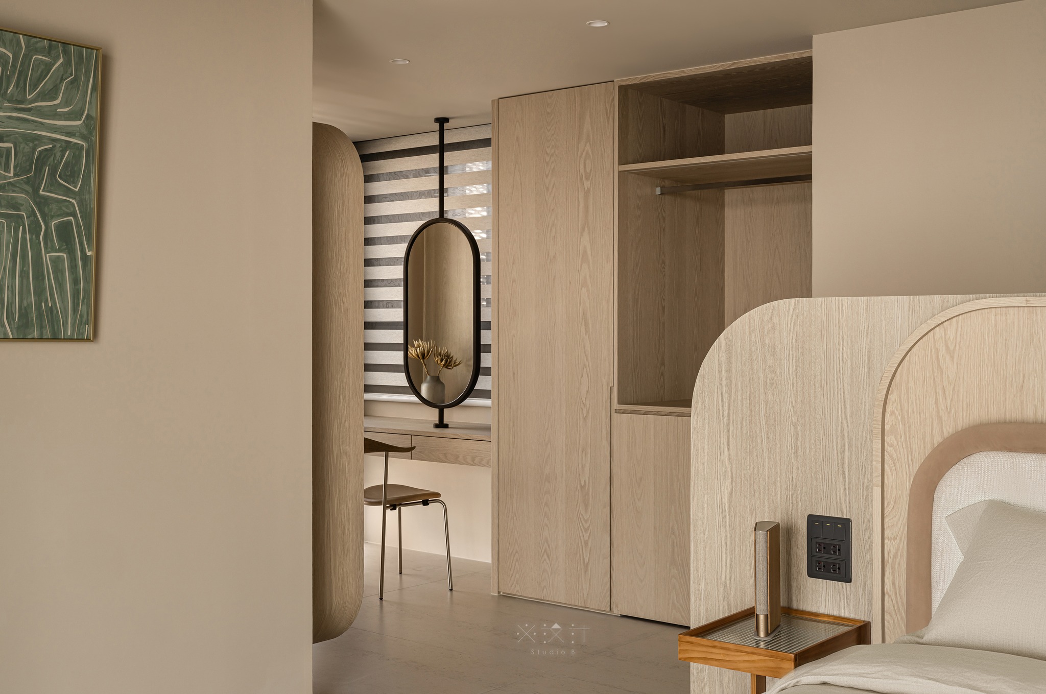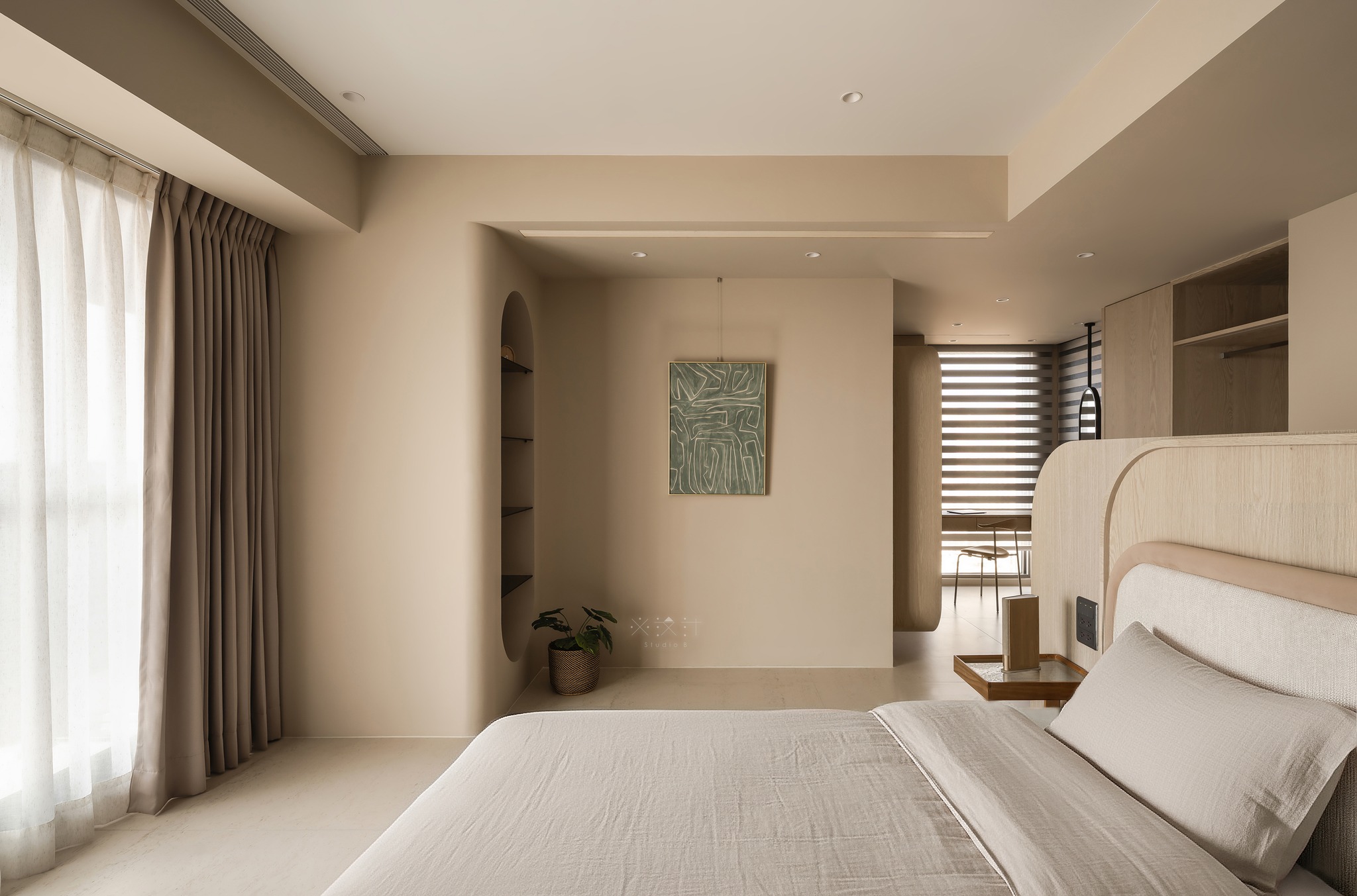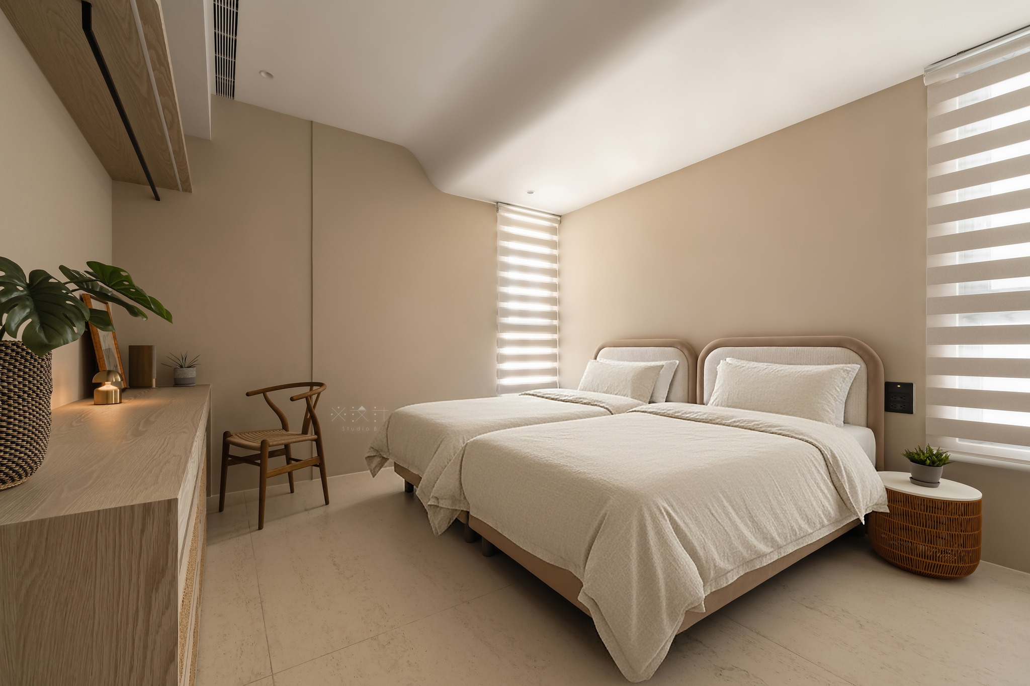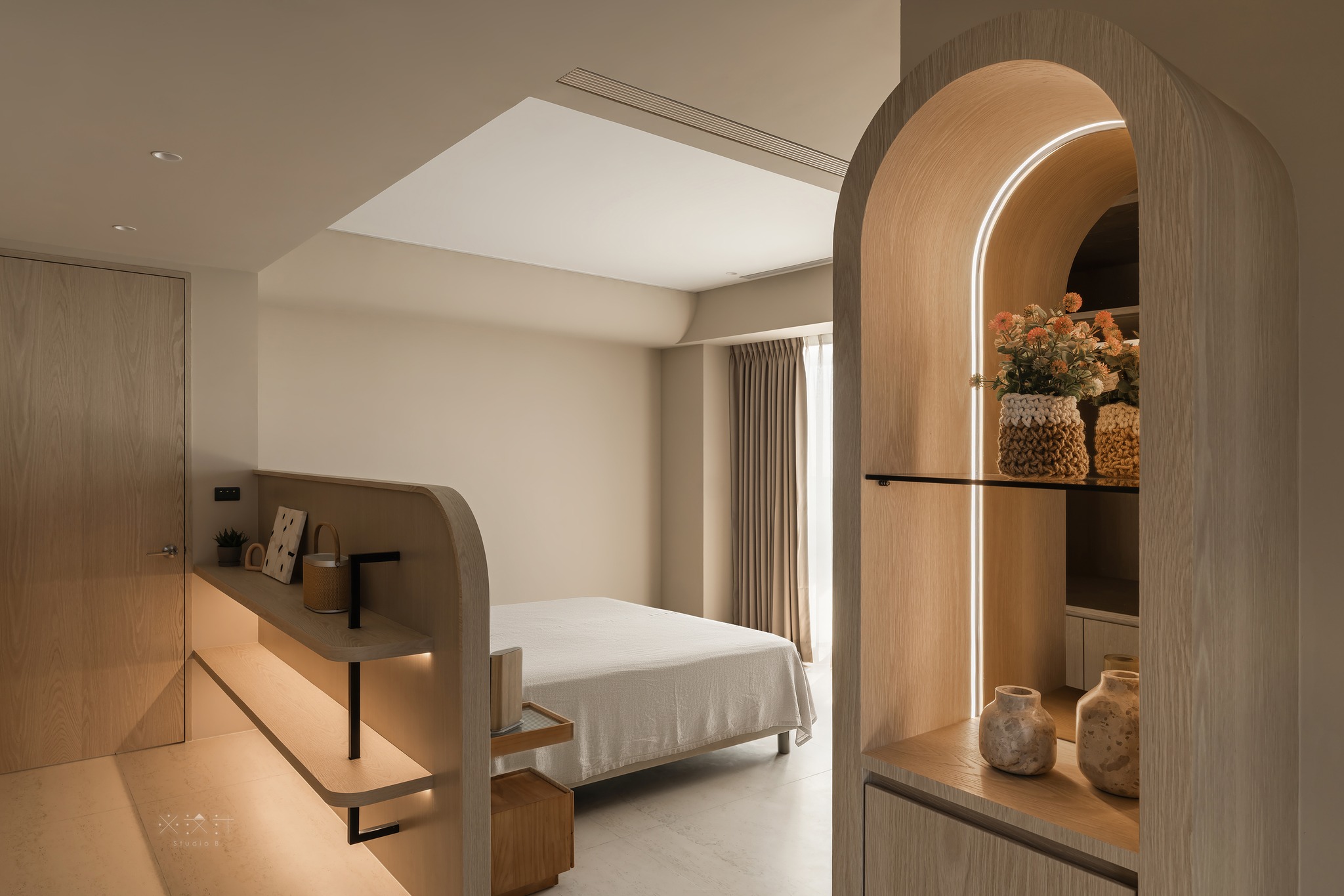 Sự mềm mại được đẩy lên cao trào thông qua hệ trần giật cấp với những đường bo tròn thay vì các góc cạnh sắc sảo. Kết hợp cùng hệ thống đèn âm trần và khe sáng (lighting cove), ánh sáng được tán xạ dịu nhẹ, giúp xóa nhòa ranh giới giữa các diện tường và tạo cảm giác không gian cao ráo, thanh thoát hơn.