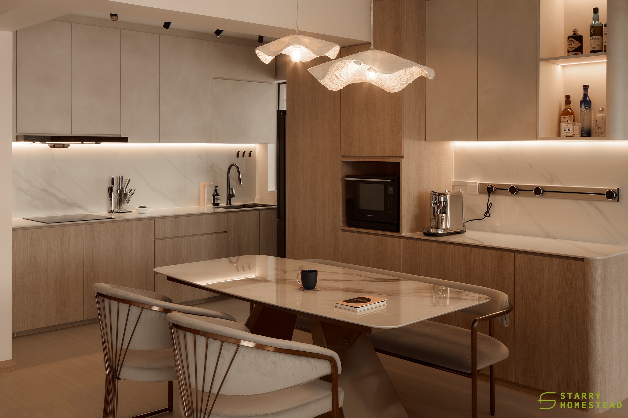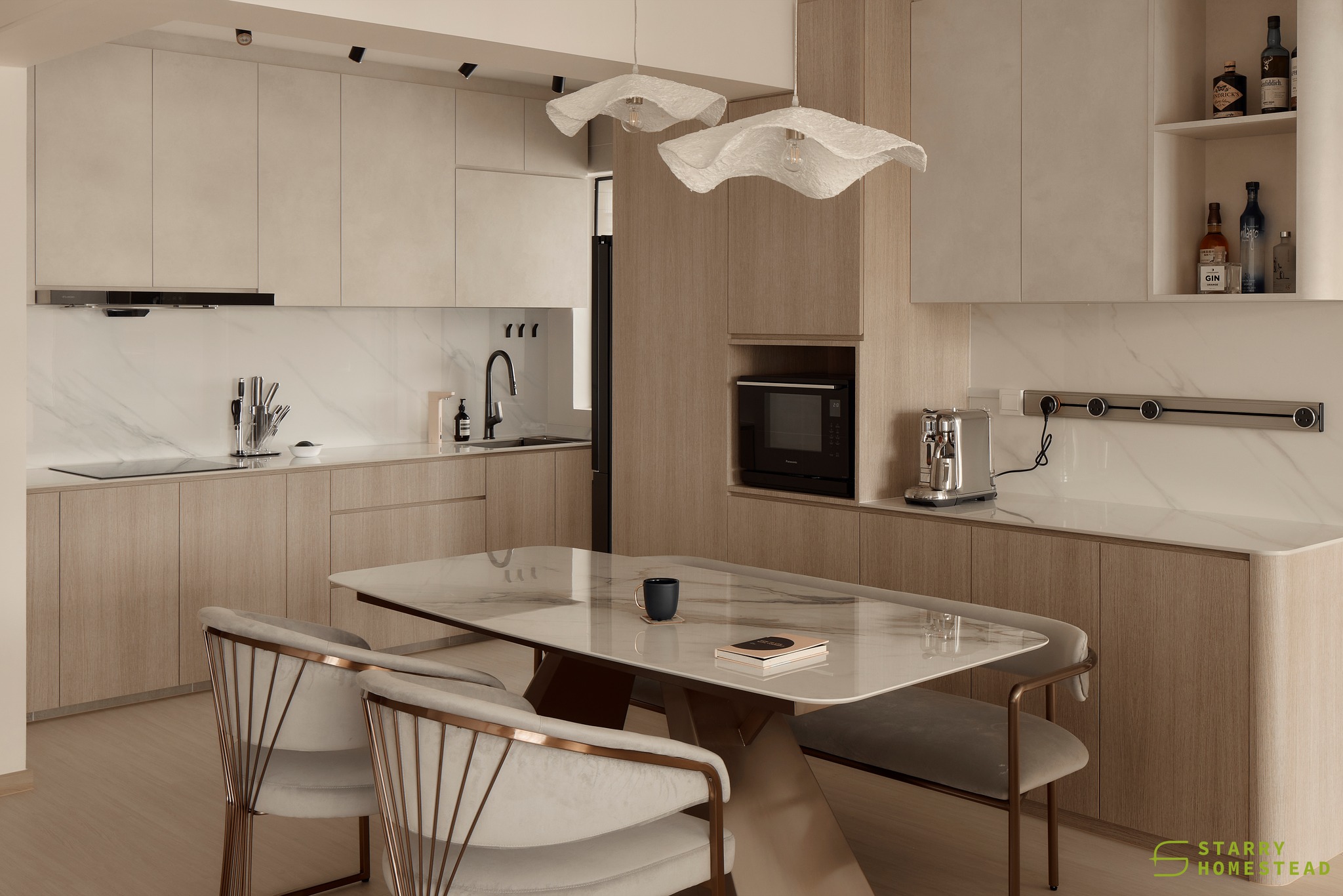 Điểm nhấn mang tính biểu tượng của không gian là hệ đèn thả trần với hình dáng uốn lượn tự nhiên, gợi nhắc đến những dải lụa mềm mại hay những vỏ sò trắng tinh khôi. Ánh sáng vàng nhẹ nhàng tỏa xuống mặt bàn ăn bằng đá marble vân mây, tạo nên một cuộc đối thoại thú vị giữa nét thô mộc của tự nhiên và sự sang trọng của vật liệu hiện đại.