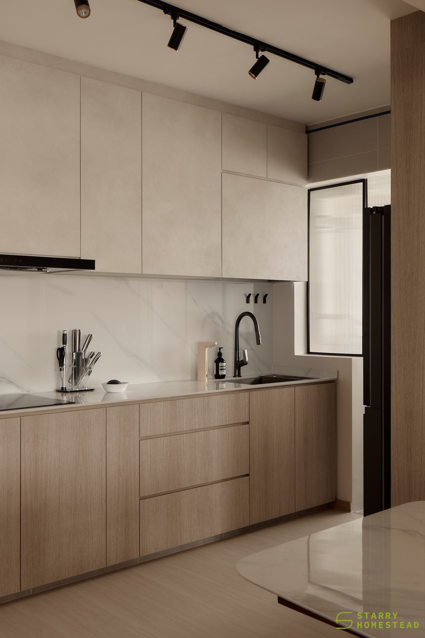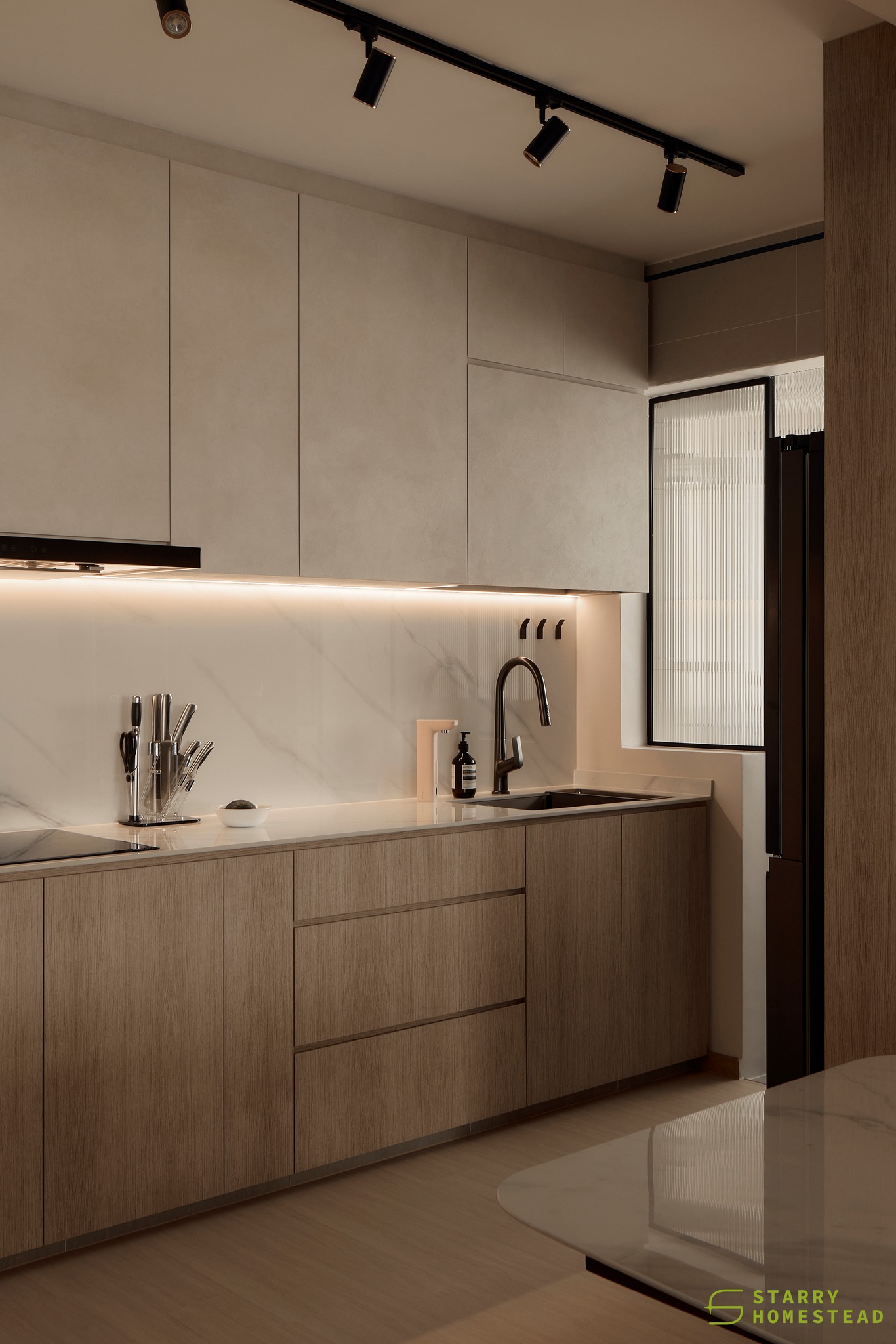 Ngay tại khu vực bếp và phòng ăn, triết lý tối giản được thể hiện qua hệ tủ phẳng không tay nắm (handleless cabinets). Sự ngăn nắp được đẩy lên mức tối đa khi các thiết bị gia dụng như lò vi sóng hay máy pha cà phê đều được tích hợp âm tủ một cách khéo léo.