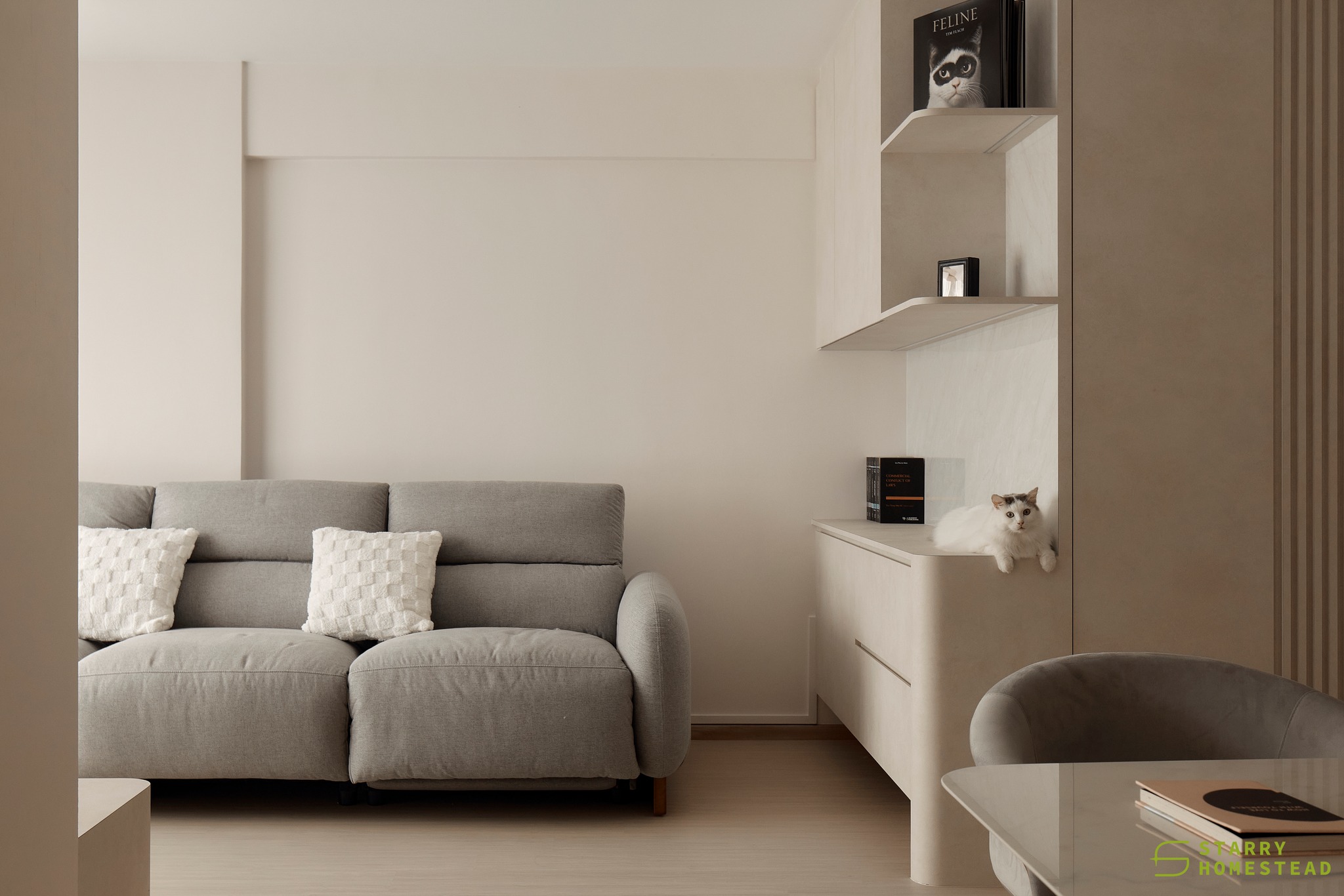 Khu vực phòng khách được định vị bởi chiếc sofa nỉ màu xám nhạt đặt cạnh khung cửa sổ lớn. Lớp rèm voan trắng đóng vai trò như một bộ lọc, biến ánh sáng tự nhiên trở nên mơ màng và dịu mắt.