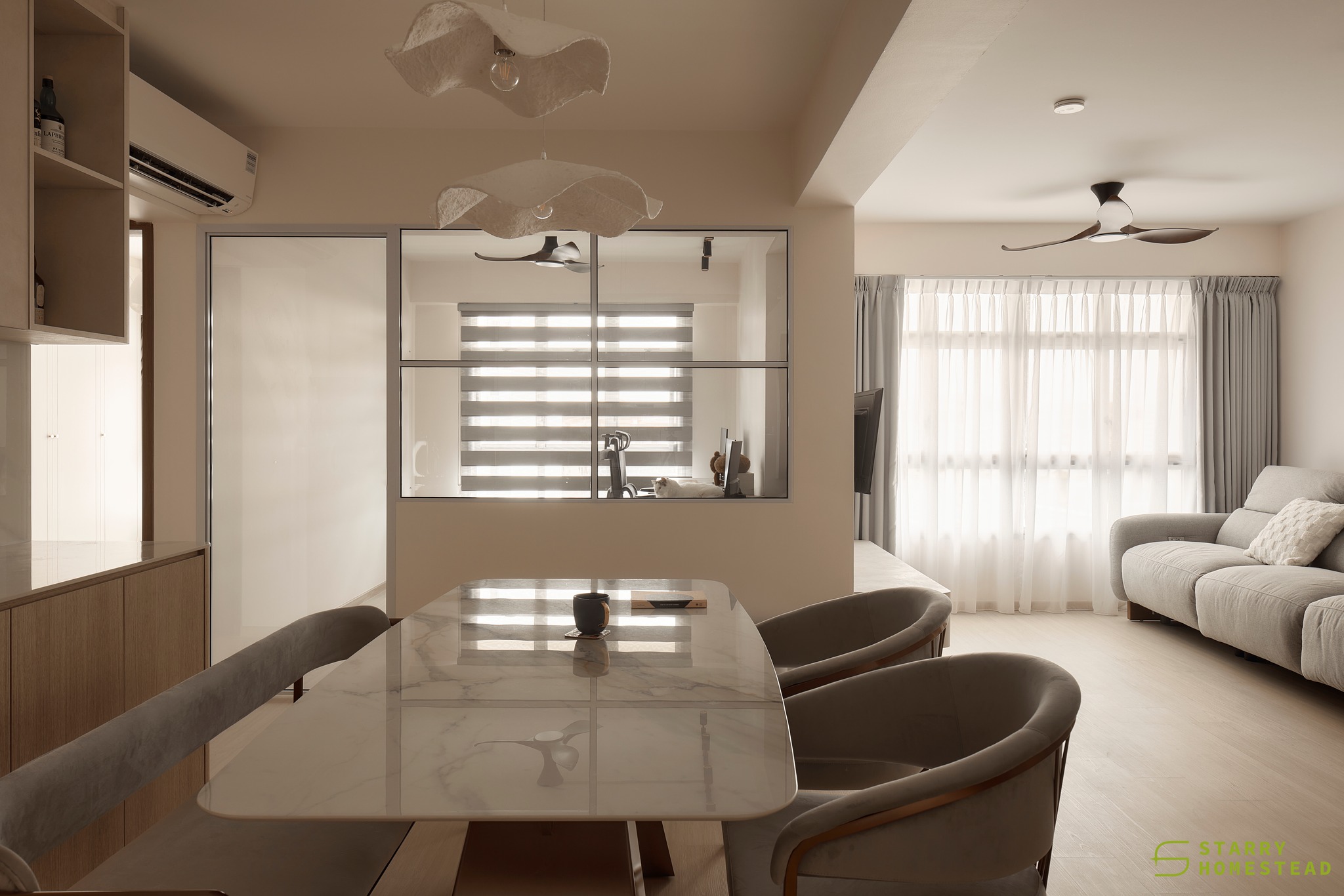 Để duy trì sự thông thoáng nhưng vẫn đảm bảo tính riêng tư cho khu vực làm việc, thiết kế sử dụng các vách ngăn kính khung thanh mảnh. Giải pháp này cho phép ánh sáng xuyên suốt qua các phòng, xóa tan cảm giác bí bách thường thấy trong các căn hộ chung cư, đồng thời tạo nên sự kết nối vô hình giữa các khu vực chức năng.