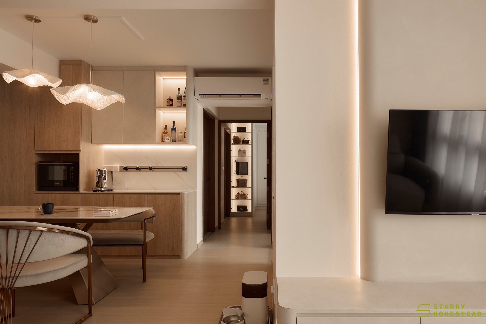 Hiệu ứng khối tích được nâng tầm nhờ hệ thống chiếu sáng thông minh. Các dải đèn LED âm tường chạy dọc theo các khe kiến trúc và hốc kệ trang trí không chỉ tạo chiều sâu mà còn biến các diện tường sơn hiệu ứng bê tông mịn trở nên sống động hơn. Những hệ kệ này không chỉ đơn thuần là nơi lưu trữ rượu hay phụ kiện cao cấp, mà còn đóng vai trò như những “hộp sáng” nghệ thuật, xóa tan bóng tối ở các góc khuất.