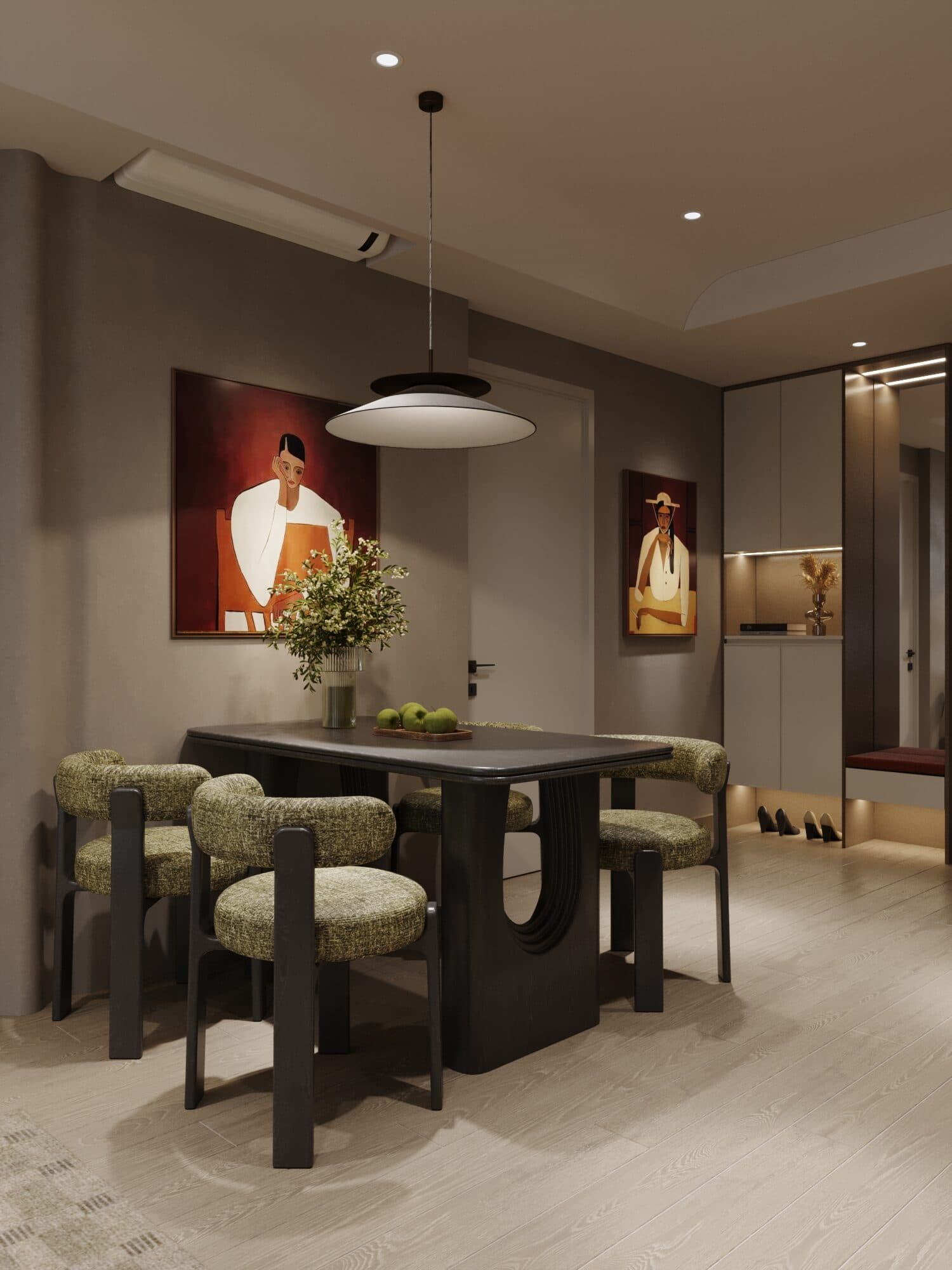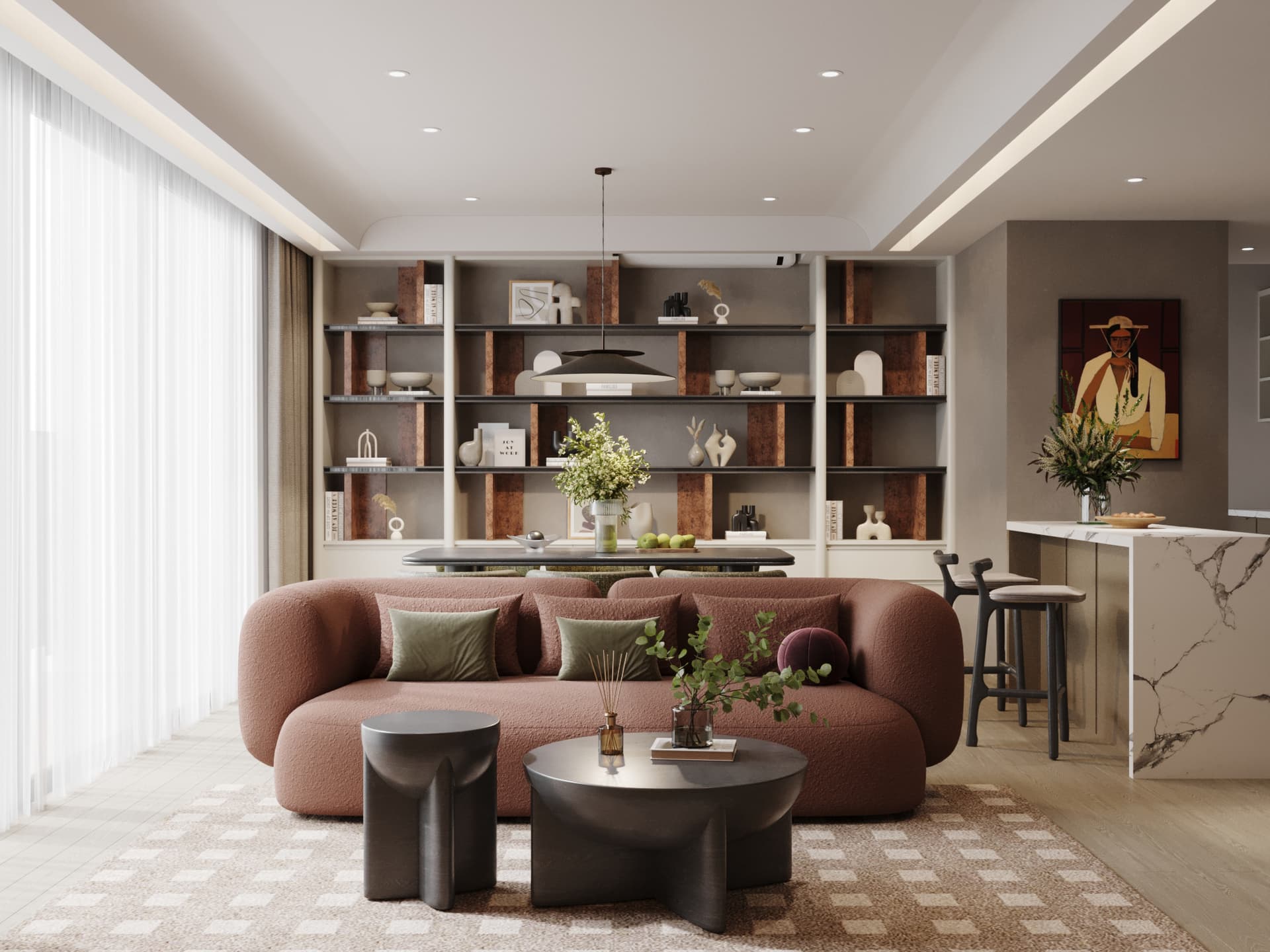 Đường nét tự do, mềm mại: Khác với phong cách Hiện đại chủ yếu dùng đường thẳng, phong cách Đương đại sử dụng linh hoạt các đường cong, hình khối điêu khắc nghệ thuật để tạo sự uyển chuyển và chiều sâu cho không gian.