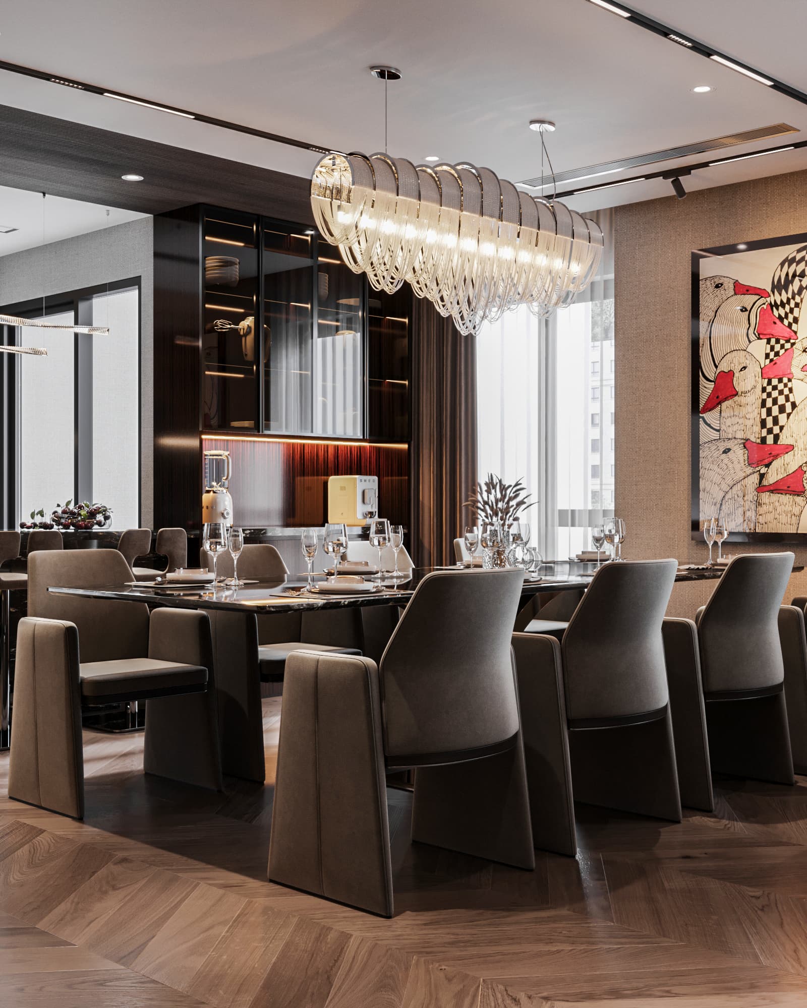 Ánh sáng lung linh, nghệ thuật: Kết hợp ánh sáng tự nhiên với hệ thống đèn chùm pha lê lớn và đèn trang trí tinh tế nhằm tạo hiệu ứng thị giác mạnh mẽ, tôn lên vẻ đẹp của nội thất.
