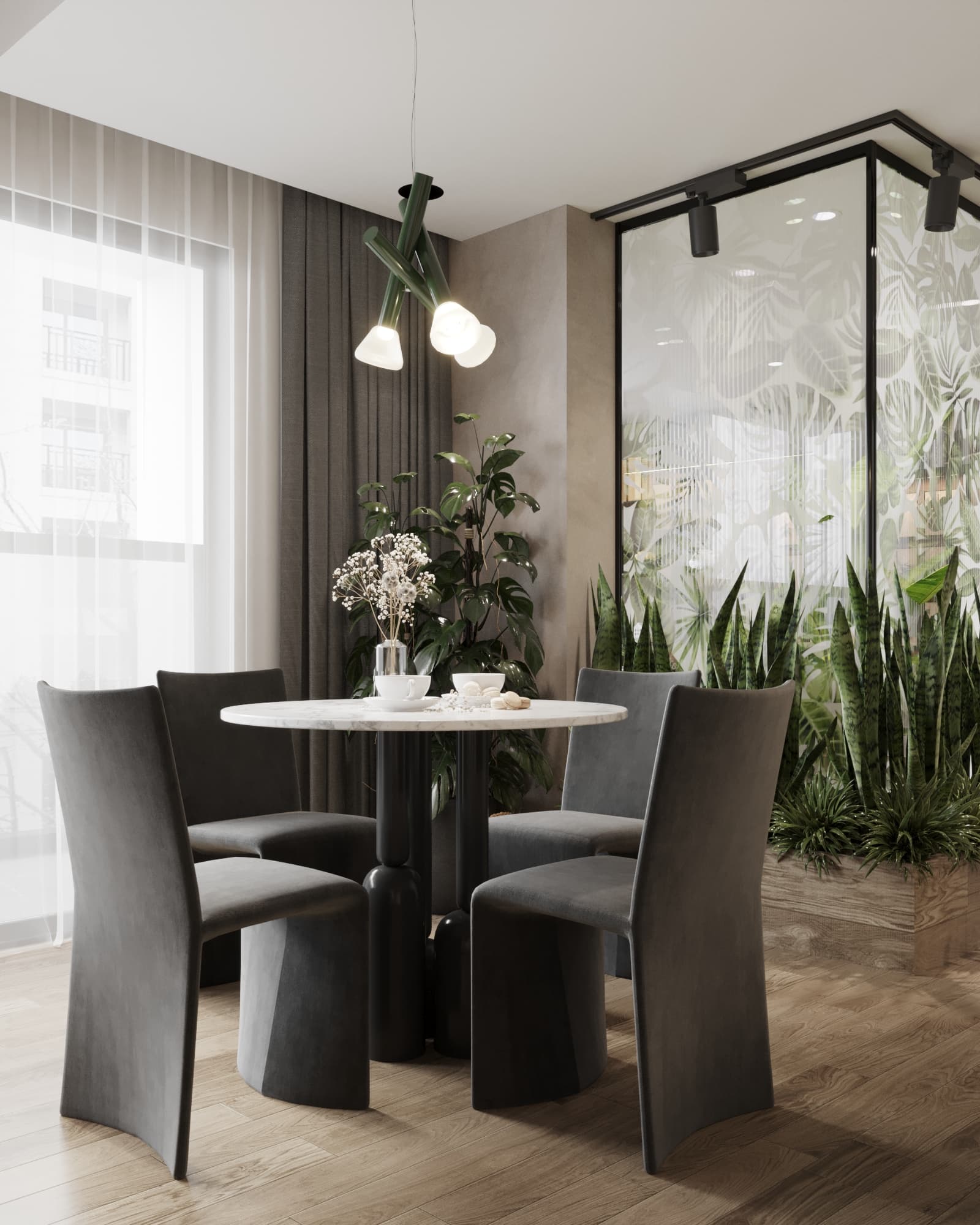 Sắc xanh là linh hồn: Cây xanh không chỉ là vật trang trí mà là yếu tố chủ đạo. Các loại cây lá rộng đặc trưng nhiệt đới như chuối cảnh, cọ, trầu bà nam mỹ (Monstera) được bố trí khéo léo khắp không gian.