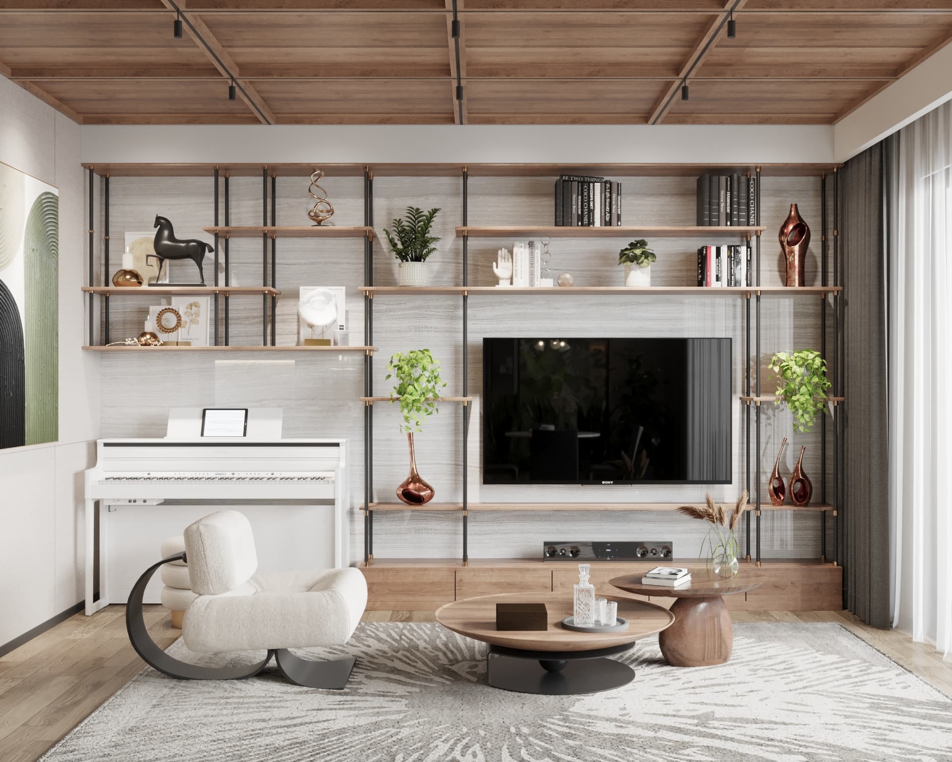 Bảng màu tươi sáng, dịu mát: Sử dụng màu trắng hoặc kem làm màu nền chủ đạo để tạo sự sáng sủa, làm nổi bật sắc xanh lá cây (Greenery) của cây cối và các gam màu trầm ấm của gỗ, đất nung.