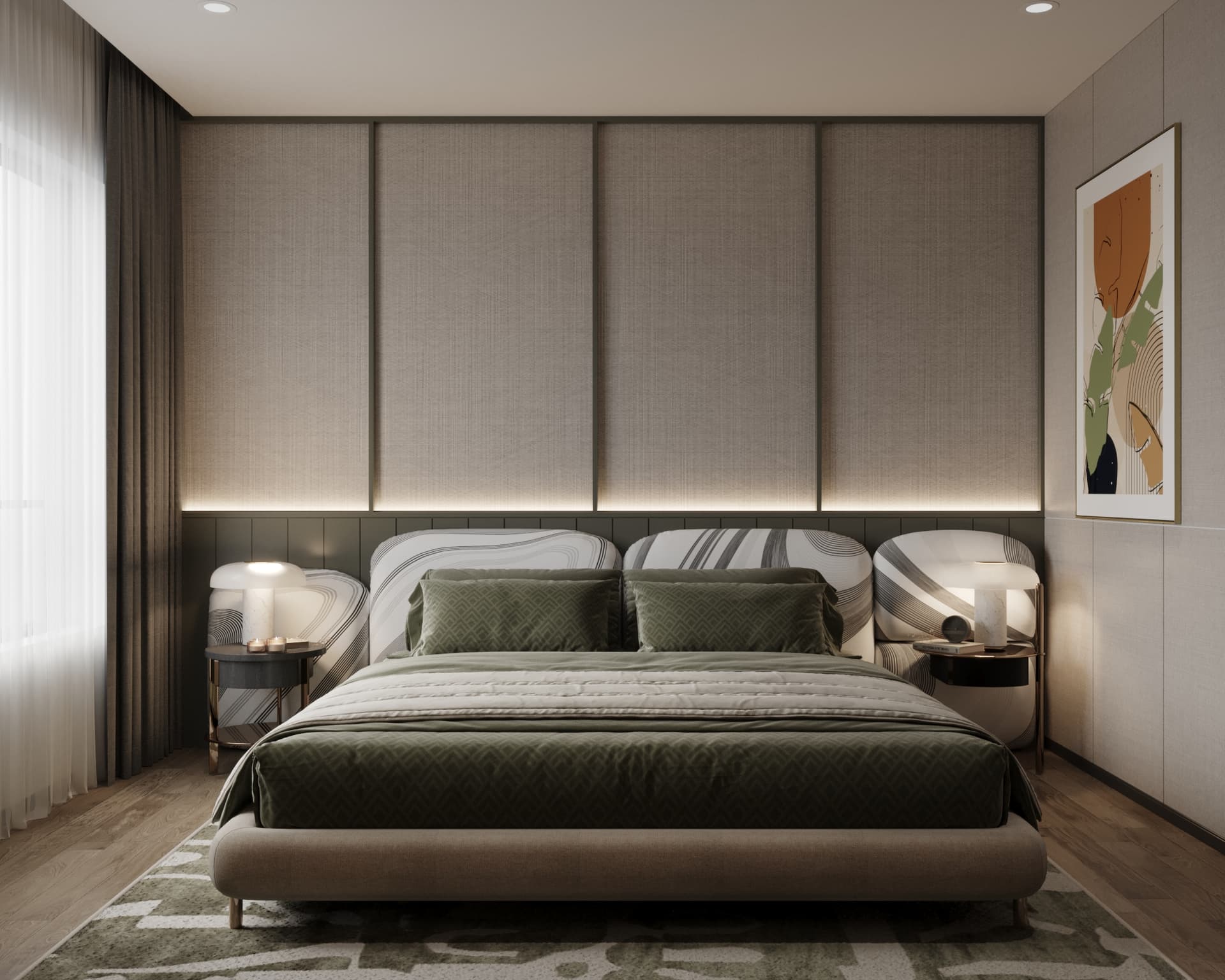 Nội thất hiện đại, thanh thoát: Đồ nội thất giữ đường nét đơn giản, tiện dụng của phong cách hiện đại (sofa vải, bàn trà gỗ trơn) thay vì các chi tiết chạm trổ cầu kỳ, giúp không gian không bị cảm giác “rừng rậm” nặng nề.