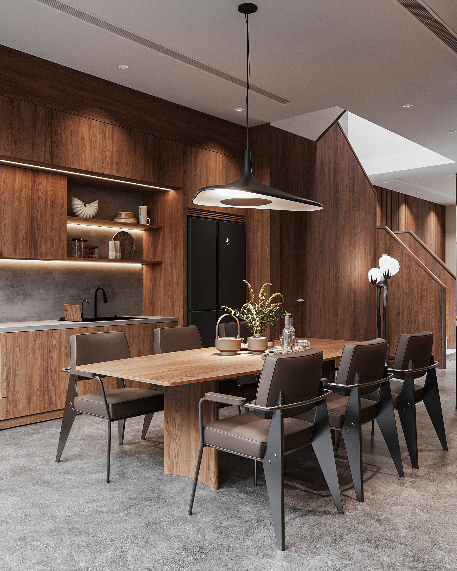 - Chất liệu công nghiệp và tự nhiên: Kết hợp giữa gỗ, kim loại, kính, bê tông và đá để tạo nên vẻ đẹp tinh giản nhưng vẫn giữ được sự ấm áp và sang trọng.